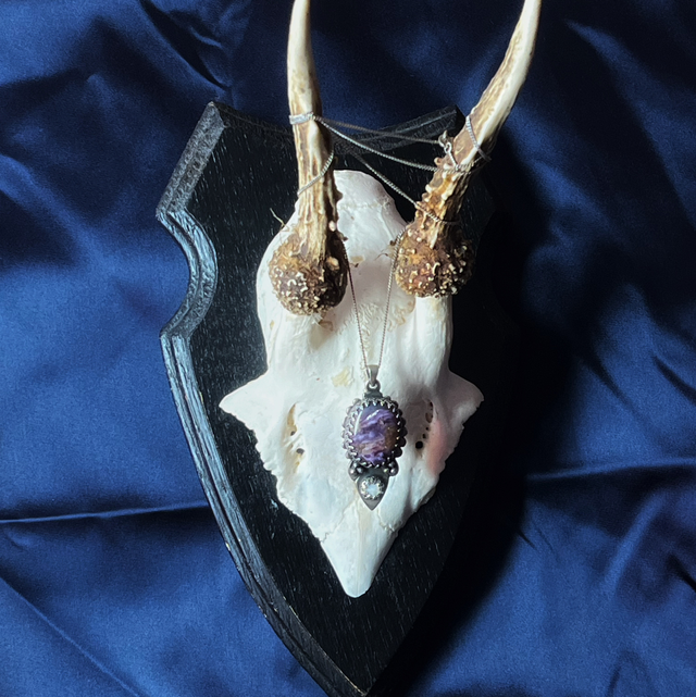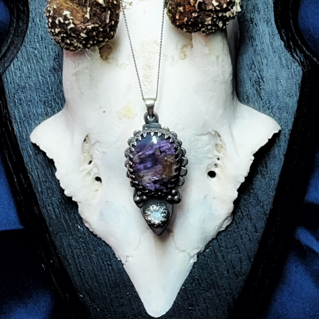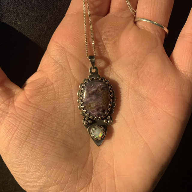 Pendentif en argent 925, charoite et opale. Chaîne en argent (45 cm) incluse.