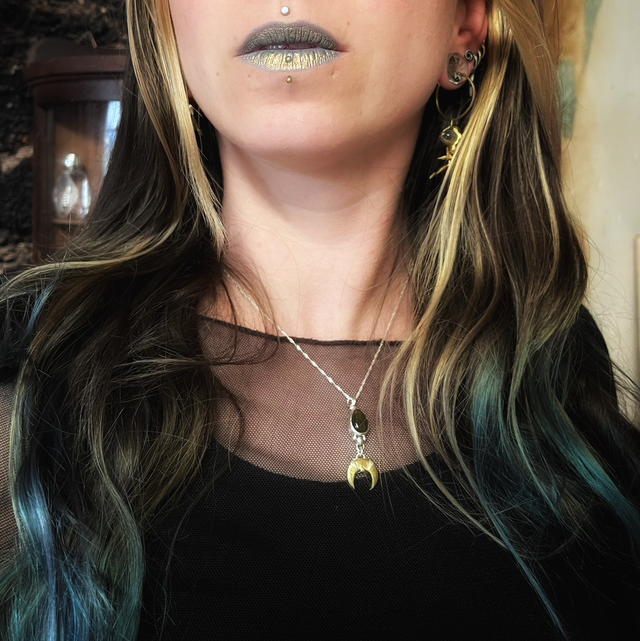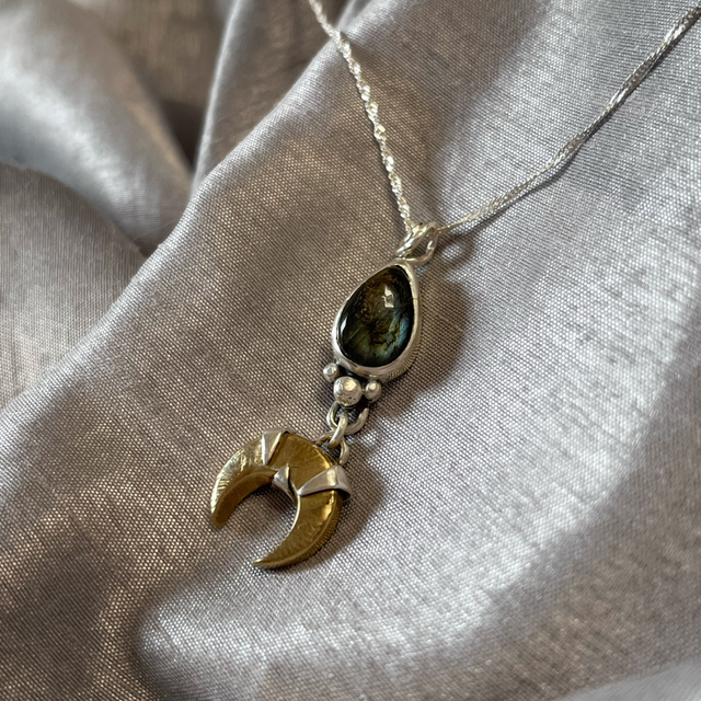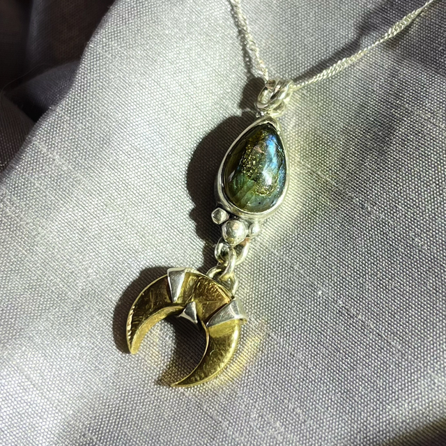 Lune de laiton en vibration vers le sol palpable et goûte de labradorite pointant vers les cieux infini, tu es le point de contact entre ces deux mondes.