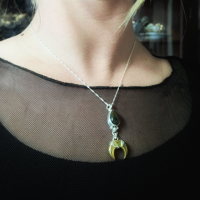 Fabriqué de façon artisanale à la main dans mon atelier des montagnes, il est accompagné de sa chaîne de 40cm en argent 925 en maille torsadée (changement de longueur ou de chaîne possible à la demande), il mesure 4cm de haut pour 1cm de large.