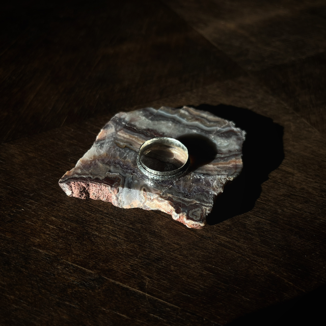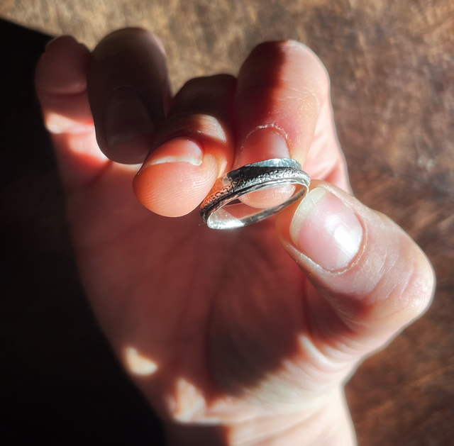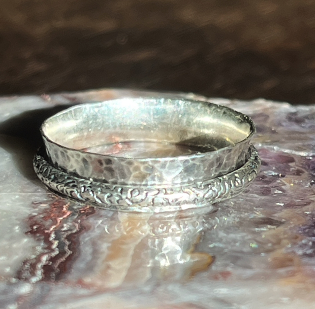 Bague en argent 925 forgé, corps de bague martelé et anneau serti mobile gravé. Taille 57