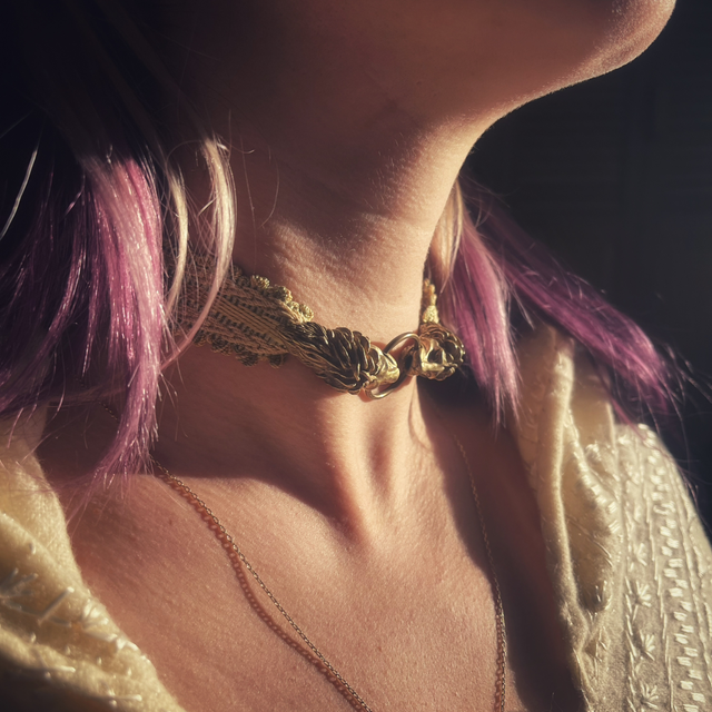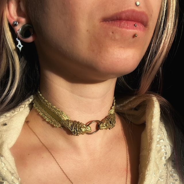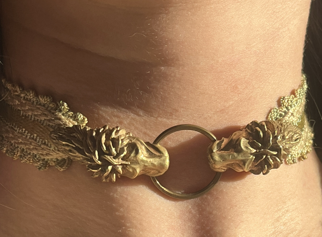 Ce ras de cou est composé d’une bande de galon tissé ancien serti de 2 têtes de lions en laiton.
