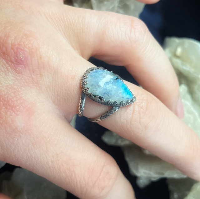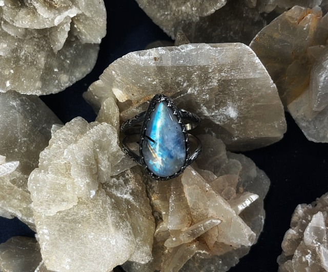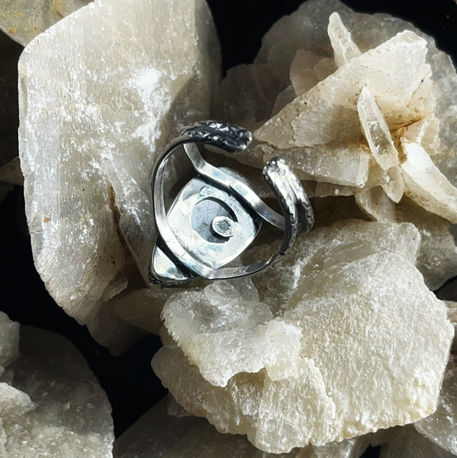 Elle est sertie sur une monture en argent forgée à la main, en taille réglable.