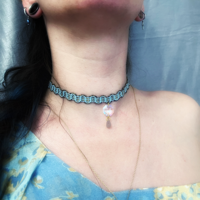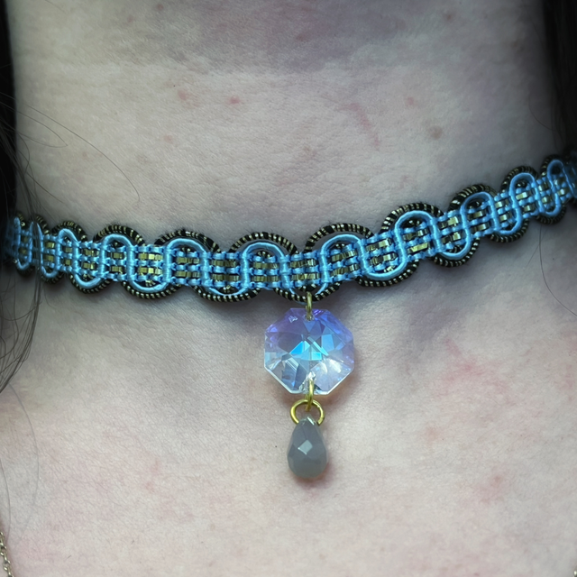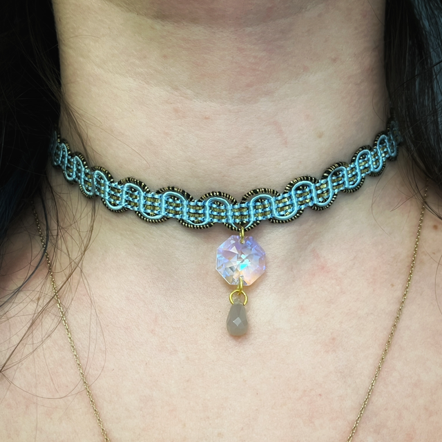Ras de cou fait à la main, tissé de galon doré, orné d’une perle Swarovski aux reflets irisés et d’une délicate perle d’agate grise.